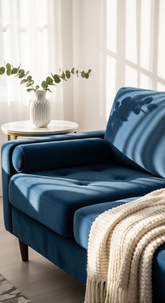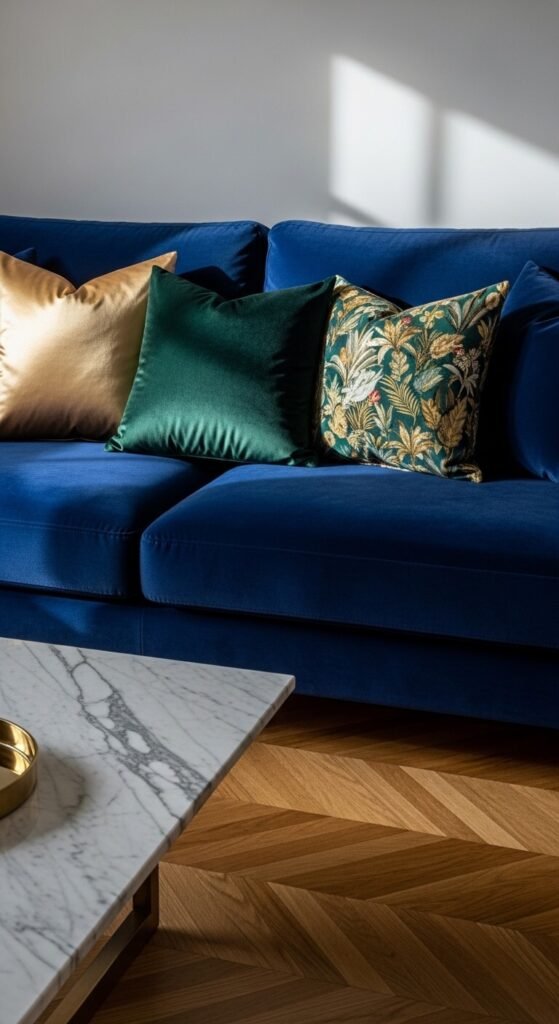 Budget tip: Look for sapphire velvet sofas at furniture outlets and end-of-season sales — you can often find solid options under $800. Throw on some gold cushion covers from a home store to finish the look without spending extra.