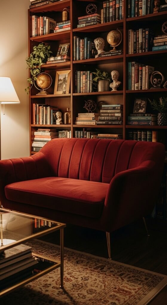 It is grounding, rich, and pairs beautifully with warm wood tones. Think walnut shelving, amber lighting, and warm rugs to complete the look.