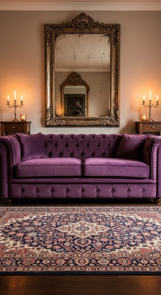 A plum tufted velvet sofa feels like something out of a Victorian study — in the best way.