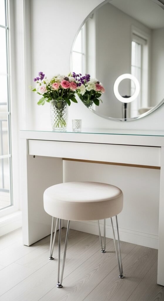 It makes a vanity corner feel like a curated beauty station. Chrome or brushed gold legs pair well with cream and keep the look fresh rather than dated.