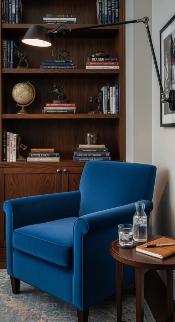 Budget tip: Club chairs in velvet are usually well-priced for the visual impact they deliver. A solid option can be found for $200–$400. If you already have a leather club chair, consider having a local upholsterer quote recovering it in cobalt velvet — it may cost less than buying new.