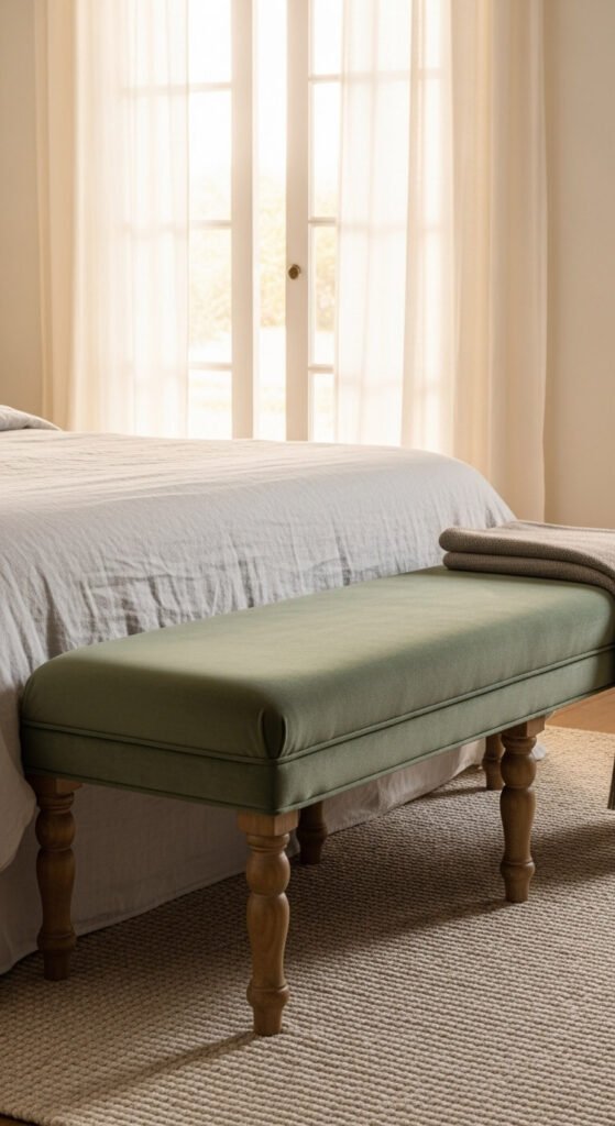 Budget tip: Upholstered benches are easy to find at affordable prices. A solid velvet bench with wooden legs can cost $80–$180. If you own a basic wooden bench, pick up a yard of sage velvet and a piece of foam to DIY-upholster it for under $40.