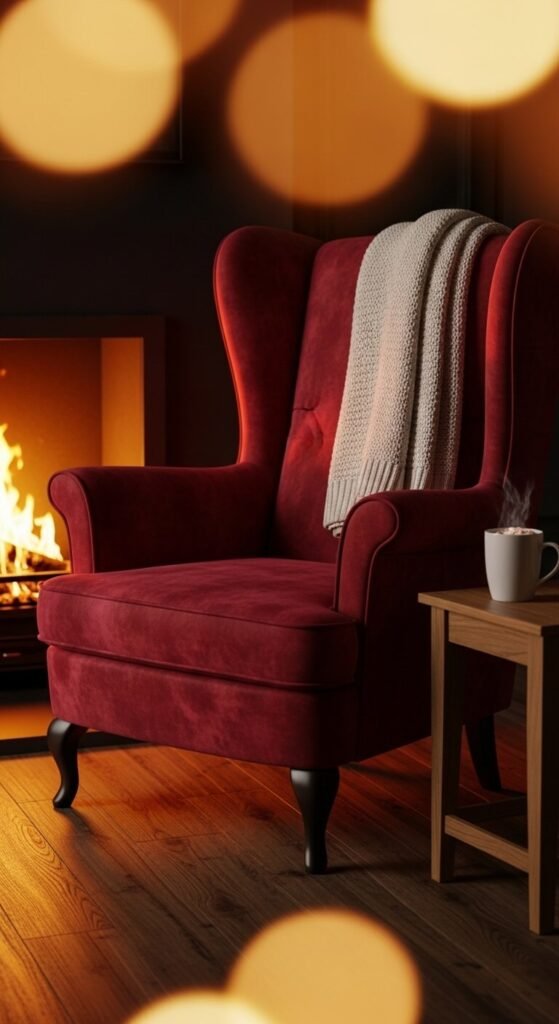 The wingback silhouette adds a sense of grandeur that few other chair styles can match. Wine and bordeaux tones photograph beautifully in warm light.