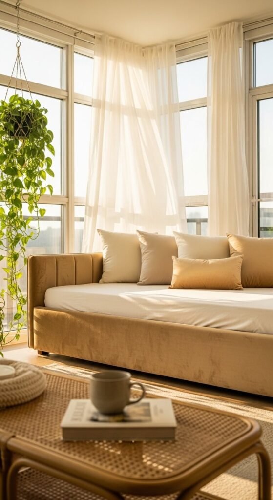 Budget tip: Daybeds are typically less expensive than full sofas. A champagne velvet version can be found for $400–$700. Add a bolster pillow at each end to emphasize the sofa silhouette during the day and style it as a bed at night with a textured throw.