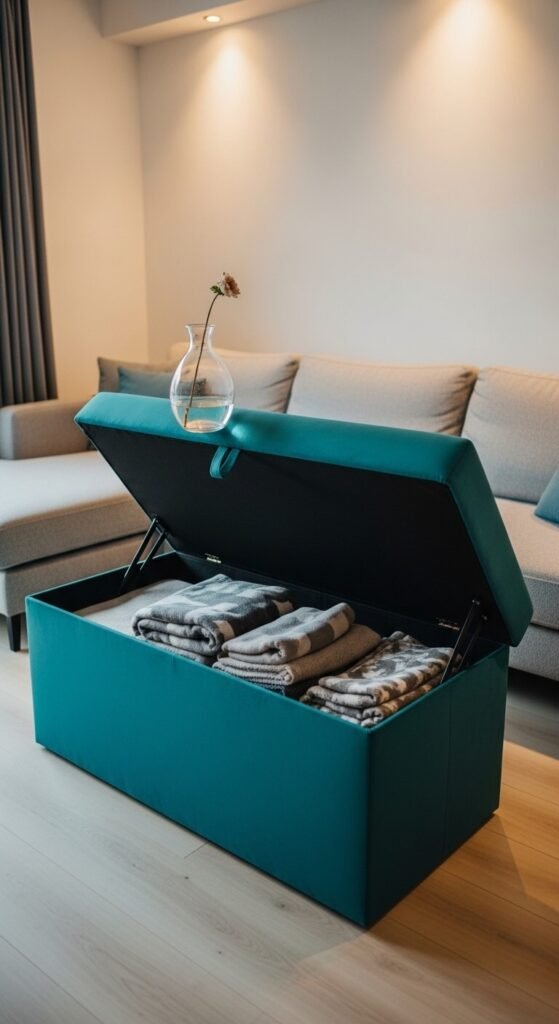 A teal velvet storage ottoman is one of the hardest-working pieces you can buy.