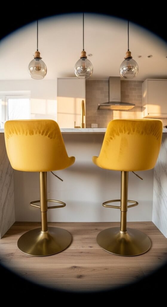 Budget tip: Bar stools in velvet often run $60–$120 each. Buy two to start. Mustard is a bold enough color that two stools make a strong statement without needing a third. If the velvet begins to flatten with use over time, a light steam with a garment steamer revives the pile instantly.