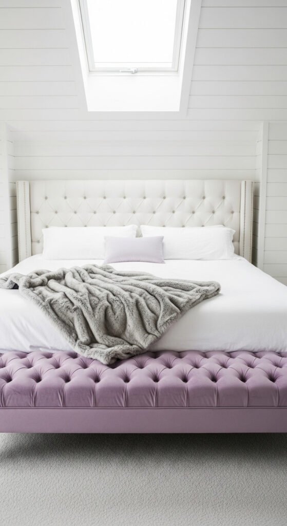 A lavender velvet tufted bench at the foot of a bed reads as soft, intentional, and elevated.