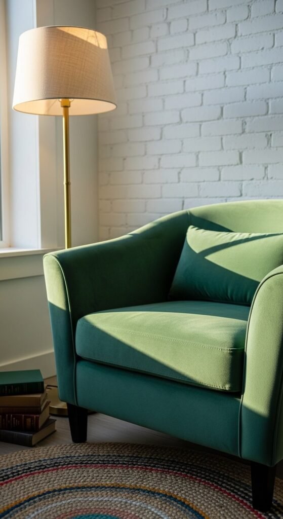 An emerald green velvet armchair is the easiest single-chair upgrade you can make.