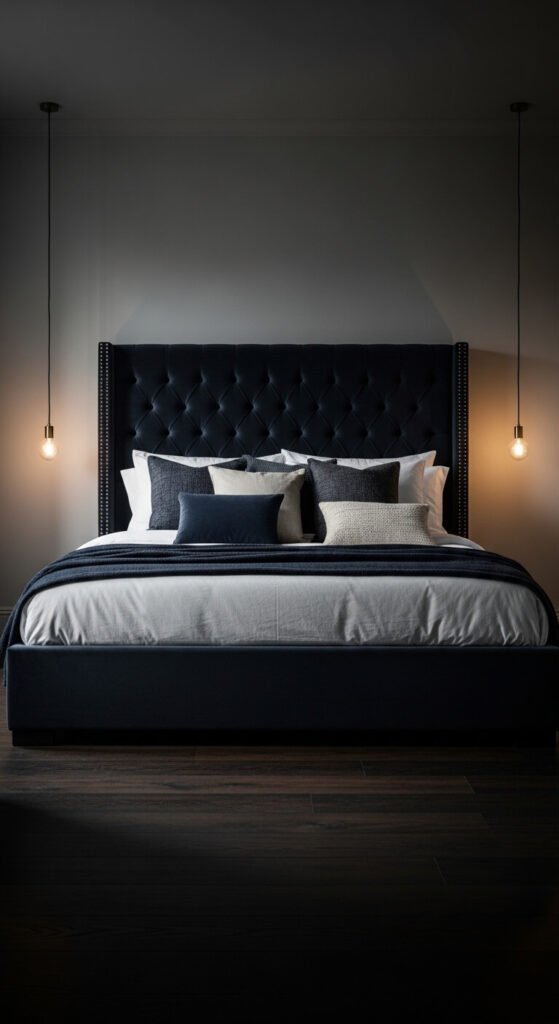 The deep color wraps the room in calm. Tufted headboard styles are the most popular — they add texture without extra accessories.