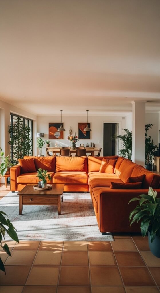 Budget tip: Sectionals are a bigger investment, but burnt orange velvet sectionals can be found in the $900–$1,800 range at discount furniture retailers. If the full cost is prohibitive, buy a matching velvet sofa and armchair instead to achieve a similar collected look.
