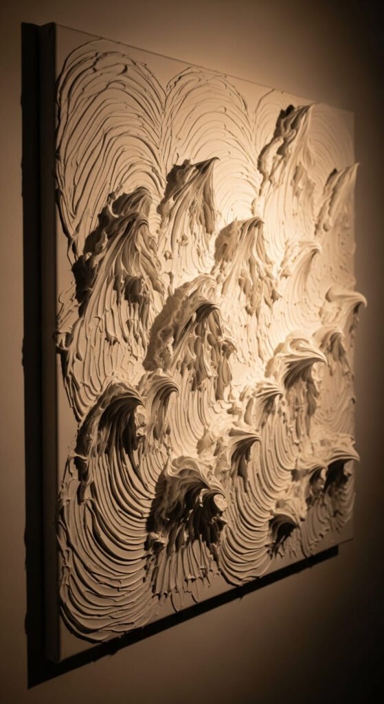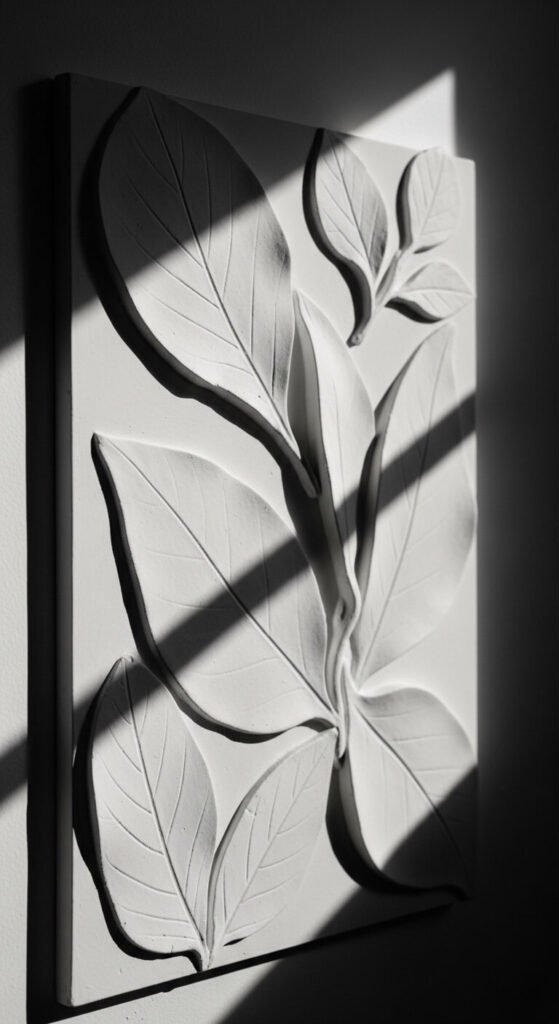 Plaster relief pieces are essentially sculptures designed for walls. You can buy them ready-made, or create your own using air-dry clay pressed into silicone molds. Paint both the piece and wall the same flat white so the form becomes purely about shadow and dimension. This trick works surprisingly well and costs under $15 in materials per piece. Mount a cluster of three to five botanical or geometric plaster pieces for a gallery-style wall that feels architectural. Light them with a directional lamp to maximize the shadow effect.