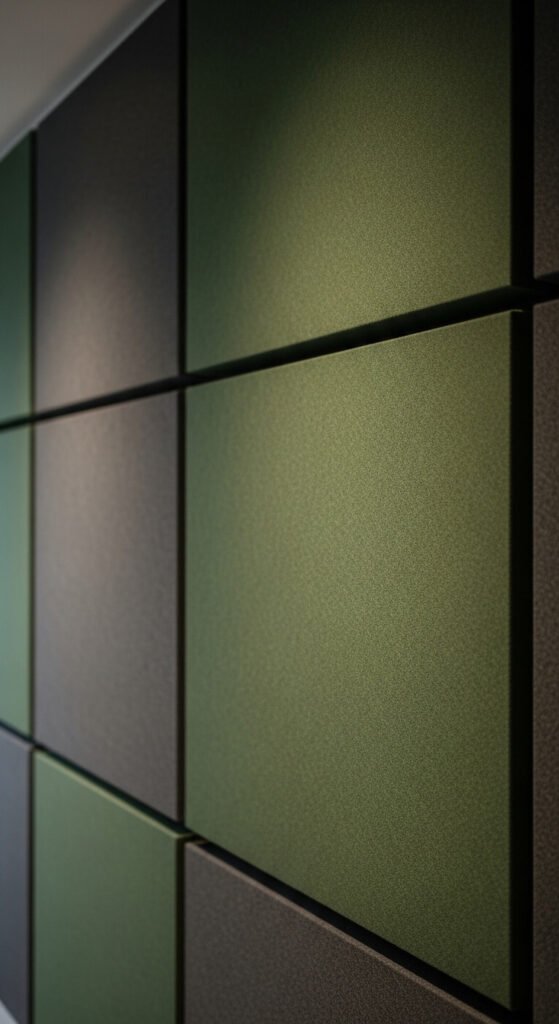 Felt wall panels solve two problems at once: texture and noise. Acoustic felt tiles are available in dozens of colors and can be arranged in patterns like a grid, chevron, or random patchwork. They mount with adhesive strips or hook-and-loop tape — no damage to drywall. DIY versions can be cut from craft felt over foam backer board. A 6-panel set in a home office costs around $40–$80. The matte finish and soft surface absorb both echo and light for a quiet, warm atmosphere.