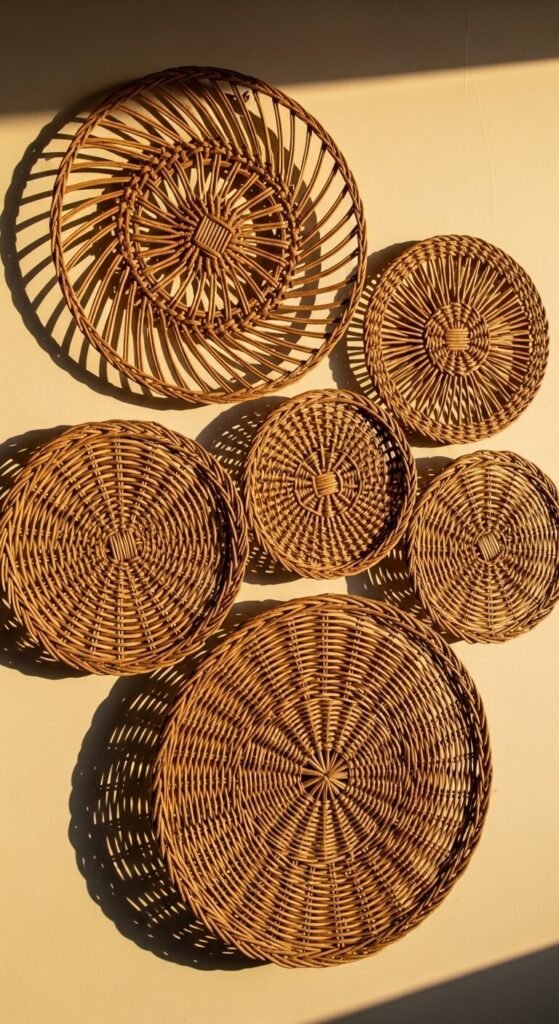 Rattan and wicker wall plates are a simple way to add organic texture in clusters. Hang five to seven plates of varying sizes in a loose arrangement on a single wall. Stagger the spacing slightly — it looks more natural than a perfect grid. Most rattan plates cost $5–$20 each, making this one of the most affordable options. They work especially well in boho, coastal, and natural modern interiors. The open weave casts interesting shadow patterns depending on where your light source sits.