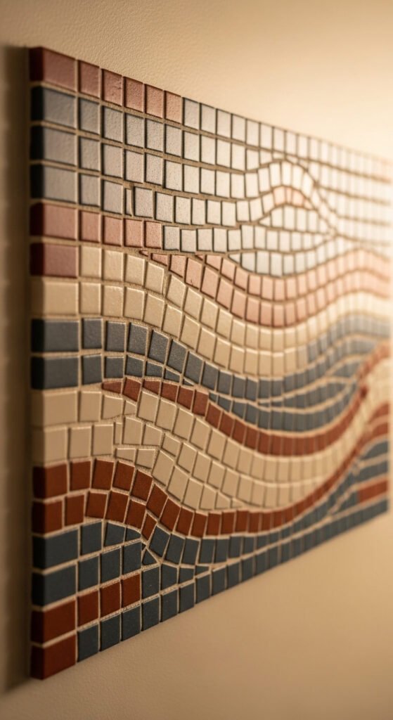 Mosaic doesn’t require professional installation. Small mosaic projects on a plywood backer can be installed like a piece of art — no tiling experience required. Use premixed tile adhesive and unsanded grout. Broken ceramic dishes, glass tiles, or even smooth pebbles all work. A 12×24 inch mosaic panel makes a strong statement in an entryway or kitchen. The grout lines and slight surface variation between tiles create real dimensional texture. Total DIY cost for a small panel runs $20–$50 in materials.