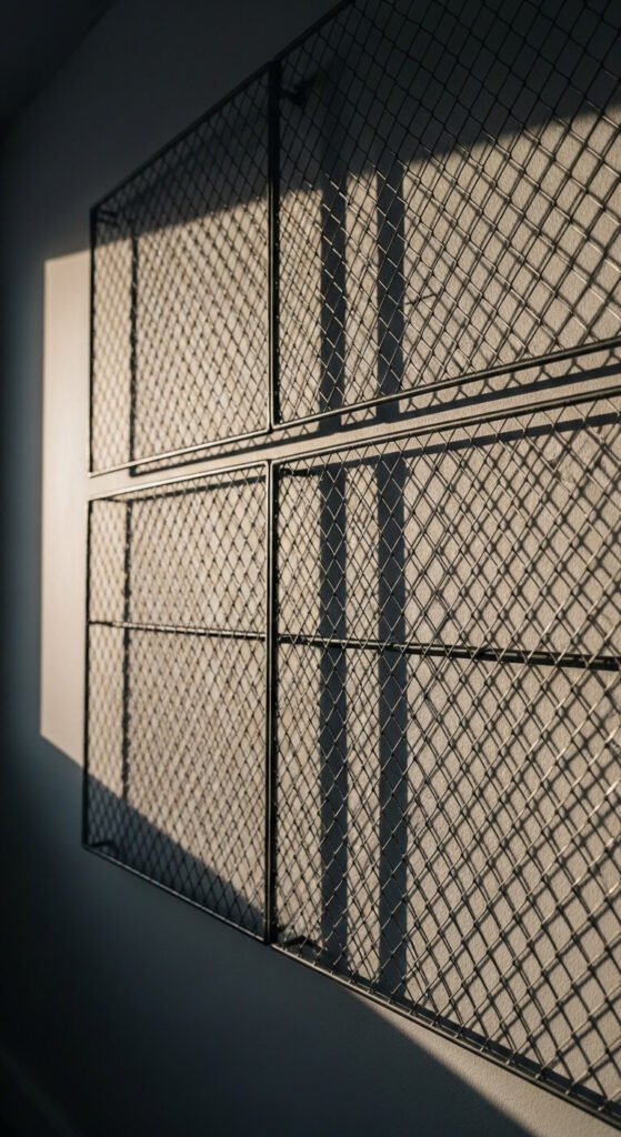 Metal adds a completely different kind of texture — hard, reflective, and graphic. Perforated metal sheets or expanded metal mesh can be cut with tin snips and mounted on a wooden frame. The shadows they cast on the wall behind are as much of the design as the metal itself. Hardware stores sell raw steel sheet for $30–$80 depending on size. Leave it raw for an industrial look, or paint with metallic spray in copper or bronze. Works especially well in offices, lofts, and kitchens with industrial finishes.