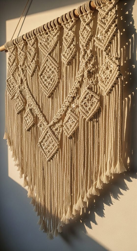 Macramé is one of the most affordable textured wall options out there. You can buy pre-made pieces at thrift stores or online marketplaces for under $30. Or make your own with basic cotton rope and a wooden dowel. Beginner knots like the square knot and lark’s head are all you need. A large piece on a neutral wall creates serious visual weight. It works in bedrooms, living rooms, and even hallways. The organic fiber brings warmth to otherwise cold or minimal spaces.