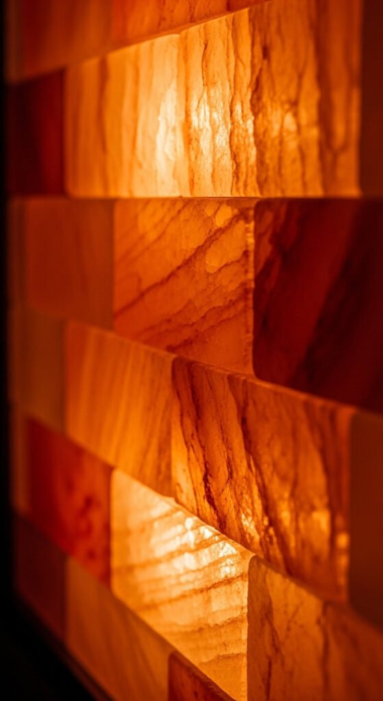 Salt tile panels are a niche but striking option. Himalayan salt tiles are sold in blocks that can be arranged into a wall panel with an LED strip behind them. The crystalline surface scatters light beautifully. Each tile is naturally translucent, so backlighting creates a warm amber glow. A small 3×4 foot panel of salt tiles costs around $80–$150 in materials. It works well in spas, meditation rooms, and bedrooms. Salt tiles are also naturally hygroscopic, so use them in dry climates or well-ventilated spaces.