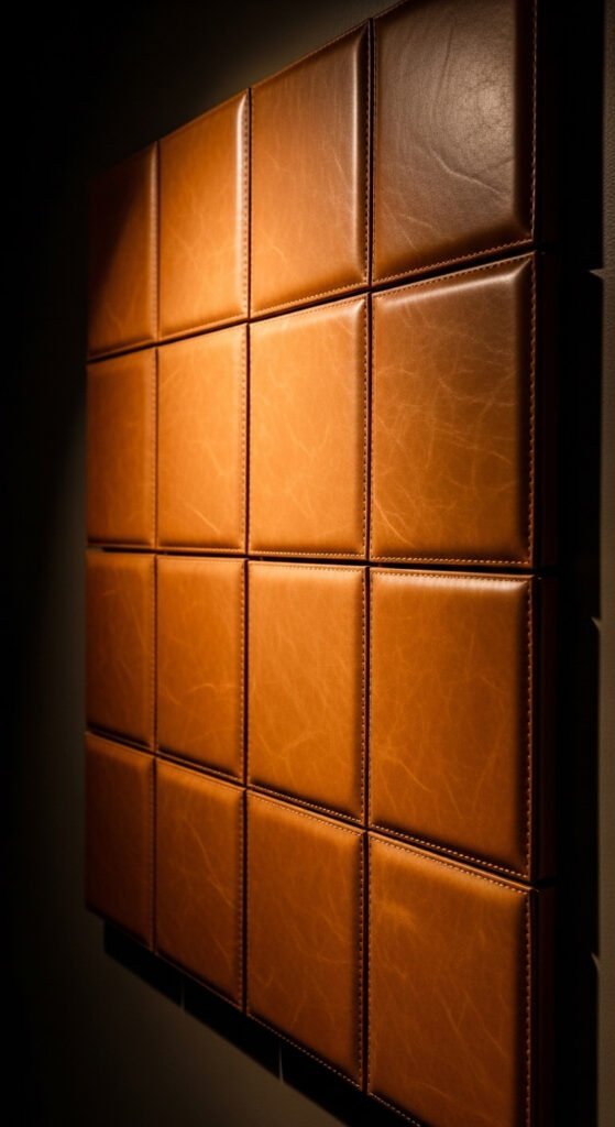 Leather wall tiles look expensive. Done right, they actually are — but you can fake the effect affordably. Faux leather tiles with foam backing are sold as peel-and-stick panels for around $2–$5 per square foot. Real leather off-cuts from upholstery shops can also be mounted on foam-backed backer board with spray adhesive. The padded, stitched look works well in home bars, offices, and media rooms. The surface absorbs sound while adding a rich, warm texture that’s unlike anything else on this list.