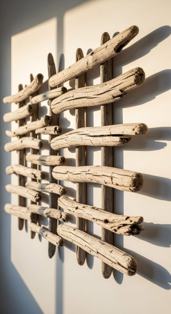 Driftwood is free if you live near a beach or river — and cheap if you don’t. Collect or purchase pieces in varying lengths and thicknesses, then mount them horizontally with heavy-duty construction adhesive or screws through a backing board. Leave gaps between pieces so the wall shows through. The bleached, organic surface brings a coastal or rustic feel to any room. Seal with a matte finish spray to prevent shedding. A full wall arrangement of mixed driftwood pieces costs almost nothing in materials and looks genuinely one-of-a-kind.