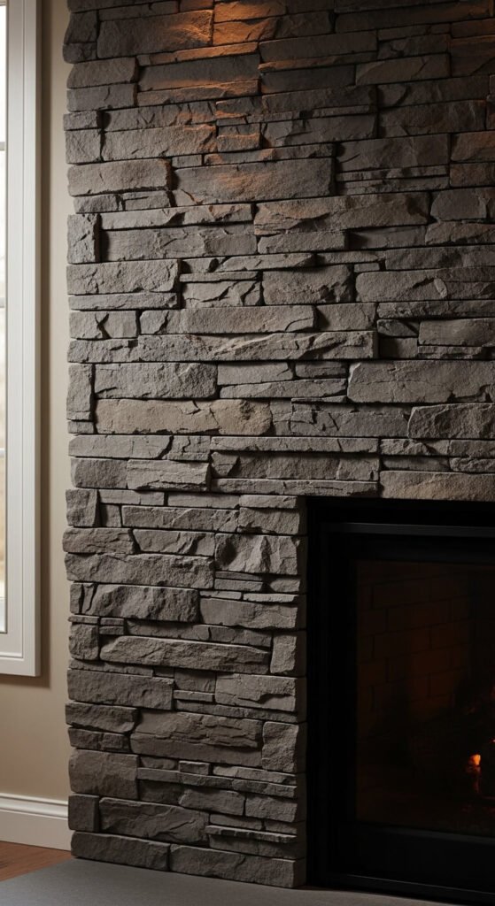 Stone veneer panels give you the look of a full stone wall without the structural work. Lightweight polyurethane or thin-set real stone panels attach directly to drywall with construction adhesive. They’re far lighter and cheaper than real masonry — panels run about $4–$8 per square foot. The depth created by each stacked row is real and dramatic. Ideal for fireplace surrounds, entry walls, or basement accent walls. Grout the seams for a traditional look, or leave them tight for a cleaner finish.