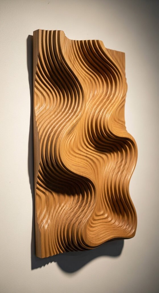 Carved wood wall art sits between furniture and sculpture. Single-panel carved wood pieces work as a focal point in any neutral room. You can find artisan versions at craft markets or through Etsy sellers for $80–$300 depending on size. For a DIY approach, foam carving tools and wide basswood panels let you experiment at low cost. Hang with a French cleat for a clean floating look. The play of light across carved surfaces changes dramatically from morning to evening light.