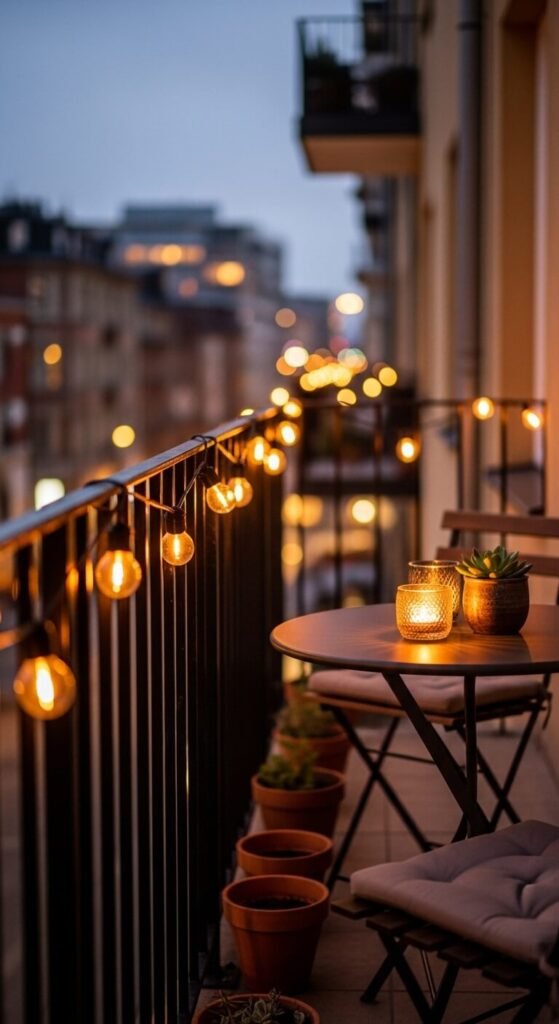 String lights are the fastest way to make a balcony feel intentional.
