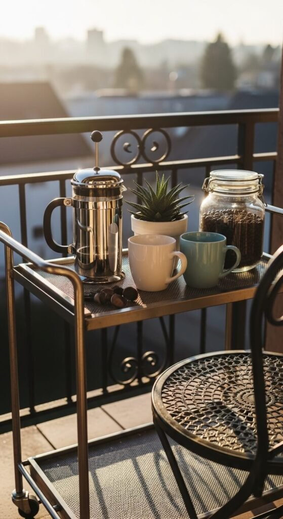 Use it as a beverage station, plant stand, or side table. Roll it out when you use the balcony and tuck it against the wall when you are done. IKEA’s RÅSKOG cart costs around $20 and works perfectly outdoors. Style it with a small plant, some mugs, a candle, and a few books. It gives function without taking up permanent floor space, which matters enormously on a small balcony.