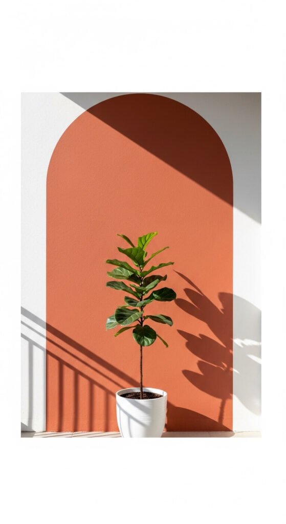 You do not need to be an artist. Paint a simple arch, stripe, or color block in one accent color. Terracotta, sage green, and dusty blue all work beautifully outdoors with the right exterior paint. A small can of exterior paint costs $8–$15 at most hardware stores. Tape off a clean arch shape and paint inside it. Place a plant in front for a styled, curated look. One wall is all it takes.