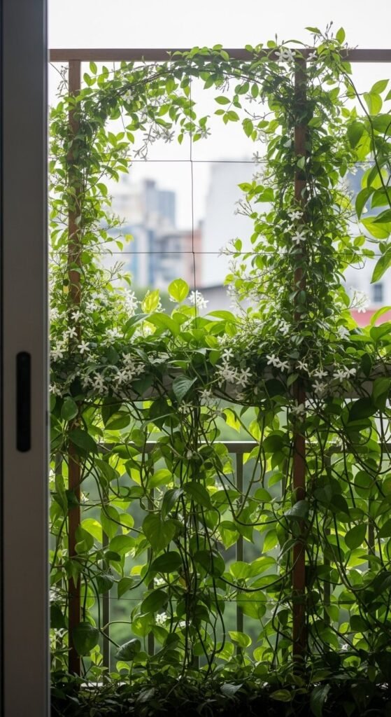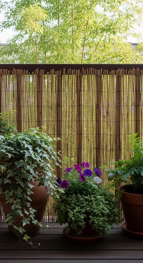 Attach a bamboo trellis or garden netting to your railing and plant fast-growing climbers like jasmine, sweet potato vine, or passionflower in pots at the base. Within one growing season, you can have a lush green wall. Bamboo screens cost $10–$20 and look great on their own while plants are still growing. This gives you privacy without the cost of structural changes — and it smells amazing when the jasmine blooms.