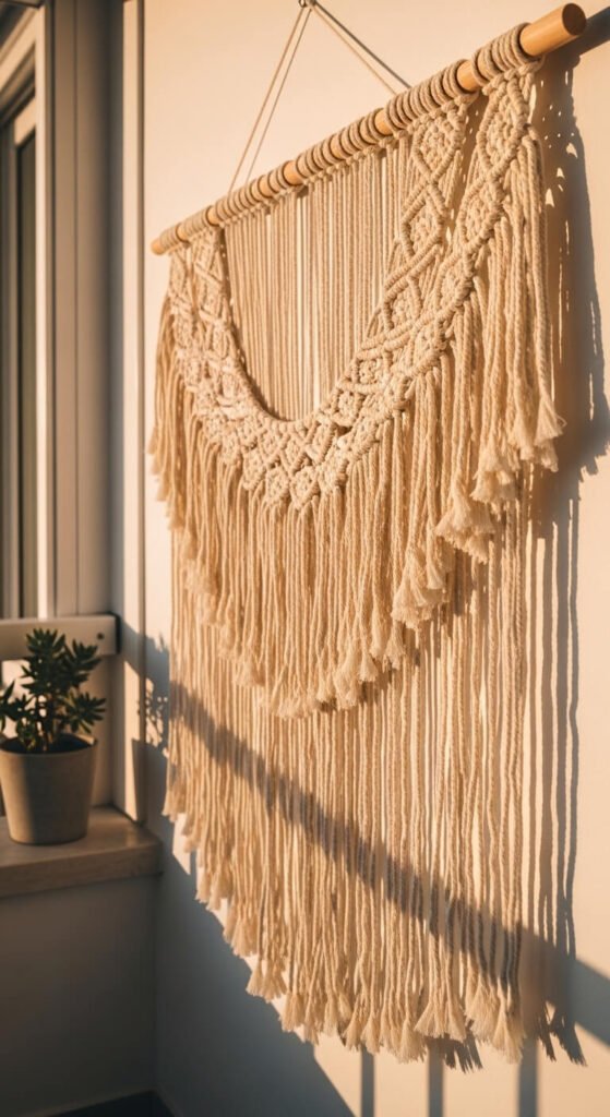 A macramé piece adds warmth, texture, and a handmade feel.