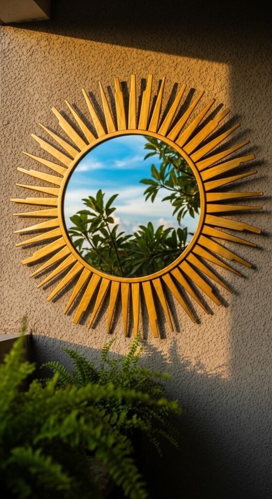An outdoor-safe mirror mounted on the wall reflects light and greenery, making the space look and feel twice its size. Look for a sunburst or porthole-style mirror with a weather-resistant frame. Hang it at eye level opposite a plant or a nice view. You can seal a regular mirror with exterior varnish to protect it. This trick is used constantly by interior designers and it costs almost nothing if you thrift the mirror.