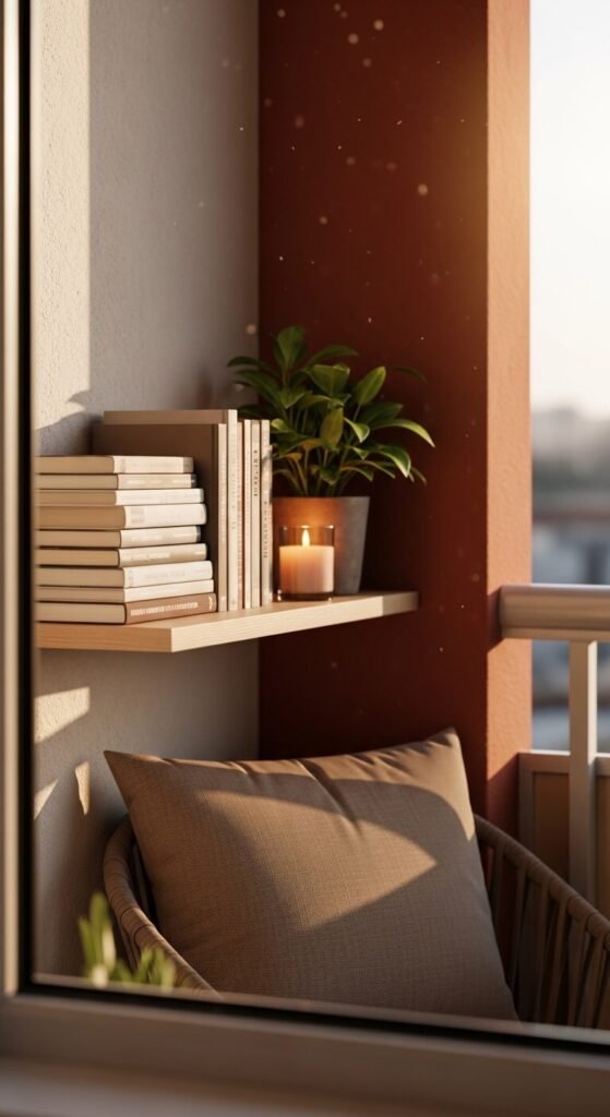 Mount a small floating shelf on the exterior wall and stock it with a few paperbacks, a small plant, and a candle. Keep the books in a weatherproof basket or box and only bring them out when you are using the space. Pair with your most comfortable chair and a blanket. This turns the balcony into an intentional reading spot — not just a place to stand. A floating shelf kit costs $10–$20 at any hardware store.