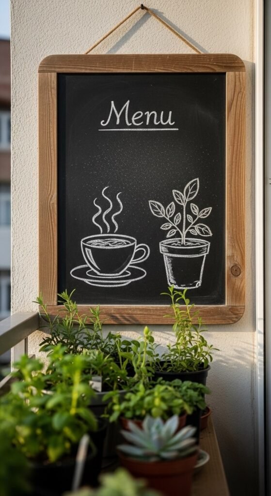 Use exterior chalkboard paint on a small piece of wood or buy a slate board with a frame. Hang it on the wall and update it with seasonal quotes, plant names, or a little drawing. This adds character and makes the space feel curated and personal. It is especially sweet if you use the balcony as a morning coffee spot. A chalkboard square costs about $8–$15 or you can make your own with a $5 can of chalkboard paint.