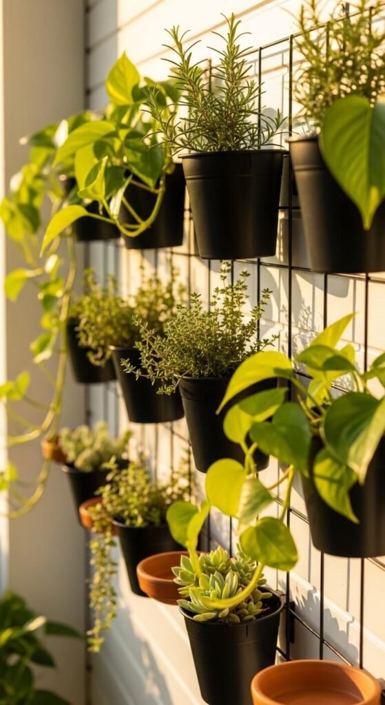 Wall-mounted planters attach directly to your railing or wall. You can find pocket planters, grid panels, or simple hooks at most hardware stores for $15–$30. Fill them with herbs like basil and mint — functional and beautiful. Trailing plants like pothos spill downward and add life without taking any floor room at all. This approach triples your greenery without touching the ground.