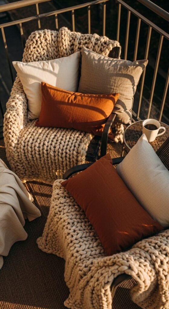 Throws, cushions, and pillows are what make people actually want to linger. Look for outdoor-rated cushion covers that resist moisture. Keep a dedicated basket on the balcony for your throws — something you can grab fast without thinking. Chunky knit blankets feel particularly cozy at dusk when temperatures drop. Layer two or three pillow sizes for depth. This costs $20–$40 total if you shop smart at discount stores or secondhand.