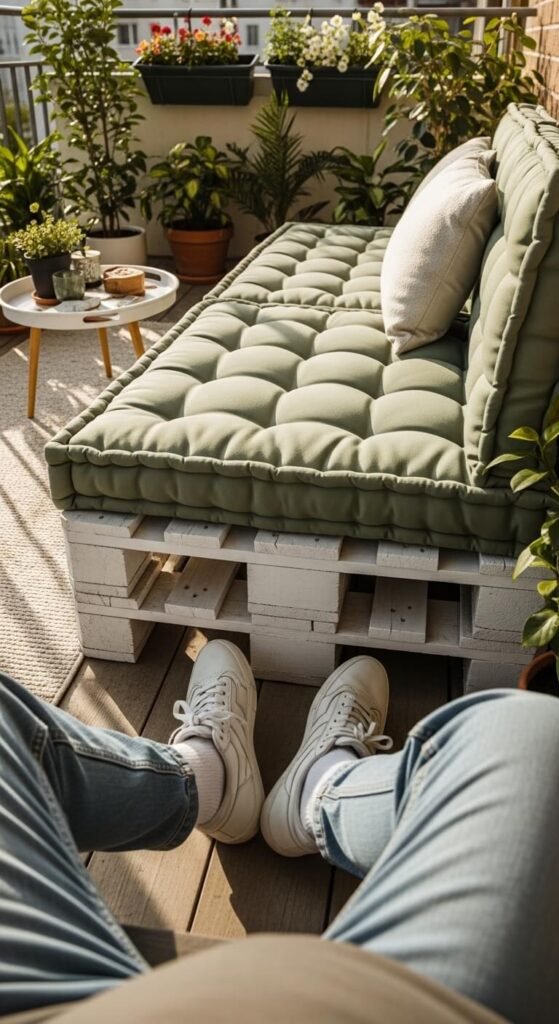 Skip bulky furniture. Instead, stack two or three large floor cushions in a corner with throw pillows against the railing. Add a low wooden tray as a mini table. This costs far less than outdoor chairs and creates a relaxed, boho feel. Look for weatherproof cushion covers or use indoor ones and bring them inside when it rains. The low profile also makes the balcony feel more open.