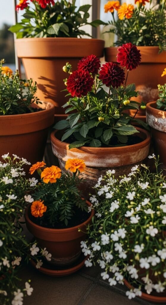 Seasonal container gardening means rotating plants by the time of year so something is always in bloom. In spring, go for pansies and violas. Summer calls for marigolds, petunias, and dahlias. Fall brings mums and ornamental kale. A single pot of blooming flowers costs $4–$8 at a nursery. Cluster five or six pots in a corner for a dense, lush effect. Deadhead regularly to keep blooms coming. Color is the single fastest mood-lifter on any balcony.