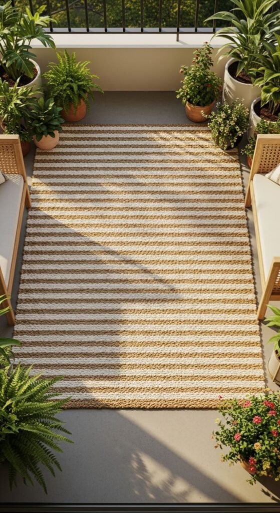 It adds warmth, texture, and a sense of interior-style comfort outside. Jute, polypropylene, or woven cotton rugs all work well outdoors. Sizes like 4×6 or 5×7 fit most small balconies perfectly. Check clearance sections at IKEA or HomeGoods — you can often find them for $20–$35. Make sure it has drainage holes or is made from a quick-dry material so it does not mold underneath.