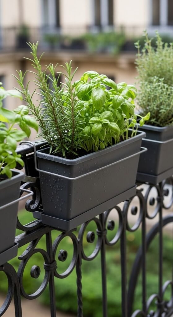Railing planter boxes hook directly onto most balcony rails with no drilling needed. Plant basil, rosemary, chives, or mint — whatever you actually cook with. A set of three planters runs about $25–$40. Water them regularly and they will grow full and lush within weeks. The smell alone makes sitting outside more enjoyable. This trick adds greenery at eye level, which makes the space feel more alive.