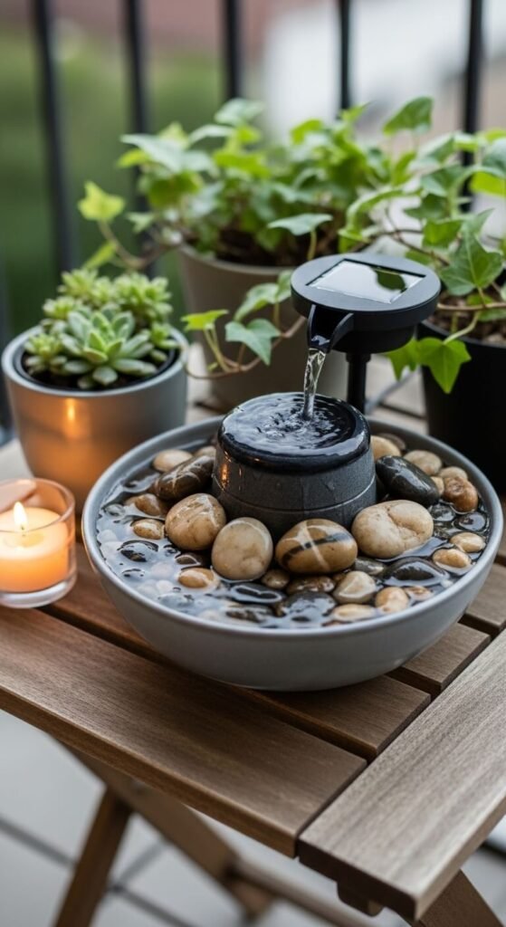 Tabletop solar fountains sit on any surface and run without electricity. They cost between $20 and $50 online. The sound masks street noise and makes the balcony feel like a private retreat. Choose a ceramic or stone style that fits your aesthetic. Place it on the bistro table or a small side table. Combine with nearby plants and the overall feel becomes genuinely serene.