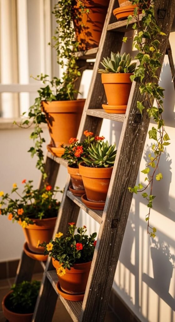 Find an old wooden ladder at a thrift store or garage sale for $5–$15. Sand it lightly, paint or stain it if you want. Then layer pots on each rung from large at the bottom to small at the top. This creates visual height and draws the eye upward, making the space feel bigger. Choose a mix of trailing plants and upright ones for contrast. It is genuinely one of the most photogenic things you can do.