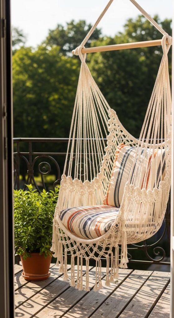 Single-point hammock chairs hang from one ceiling hook and can hold an adult comfortably. They cost $25–$60 and come in cotton, macramé, or woven styles. As long as you anchor it into a joist or use a heavy-duty hook designed for concrete ceilings, they are safe and sturdy. Curl up with a book, a blanket, and a drink. Nothing says “cozy balcony” quite like gently swinging in the open air.