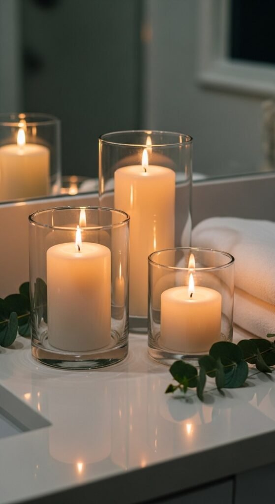 Candlelight turns ordinary baths into ceremonies. Use unscented or lightly scented options to avoid overpowering essential oils. Glass hurricanes protect flames from water splashes and drafts. Group candles in odd numbers for visual appeal. Battery-operated LED candles work for worry-free ambiance. Real candles cost $10-$30 for quality versions that burn cleanly. Place them on stable surfaces away from curtains. Dim the lights and let the flickering glow work its magic on your stress levels.