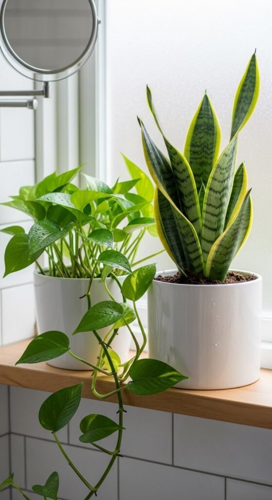 Bring life into your bathroom with moisture-loving plants. Pothos, snake plants, and ferns thrive in humid environments. They purify air naturally while adding organic texture. Place them on shelves or hang in macrame holders near windows. Water once weekly or when soil feels dry. Plants cost $10-$30 at nurseries. They absorb excess moisture and prevent mold growth. Your bathroom feels alive and oxygenated instead of sterile. Caring for them becomes part of your calming routine.