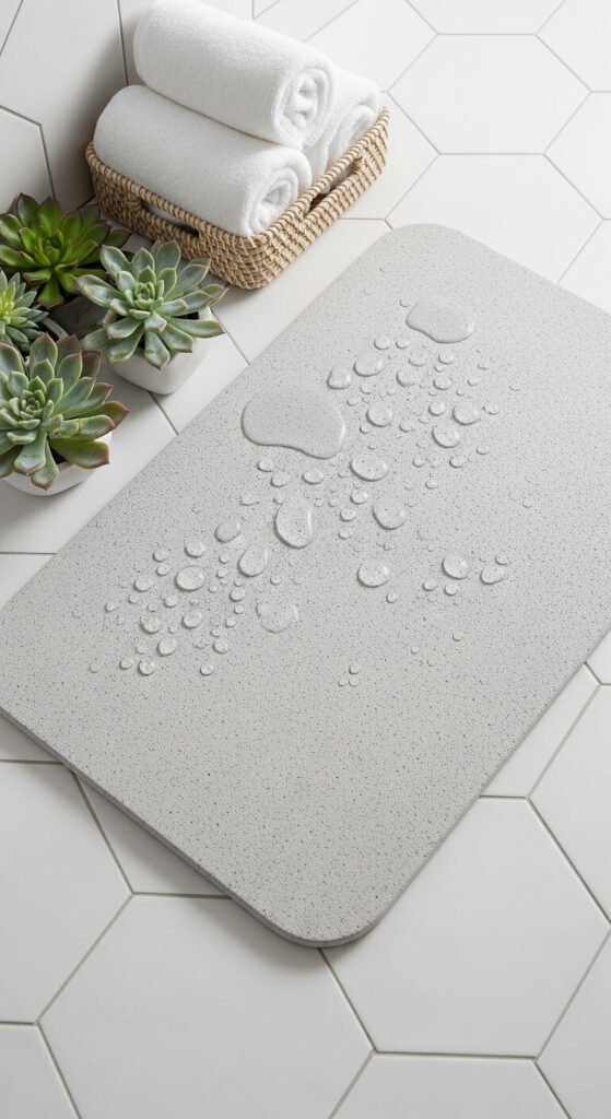 Diatomaceous earth mats absorb water instantly and dry in minutes. Step out of the shower onto a surface that never feels soggy or develops mildew. Unlike fabric mats, these require zero washing—just rinse occasionally. The smooth stone texture feels amazing underfoot. Sand the surface lightly every few months to maintain absorption power. Find them for $20-$40 online. They work perfectly in humid climates where traditional mats stay damp. No more musty bathroom smells or laundry pile additions. Clean, quick, and seriously satisfying.