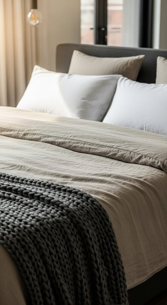 Layer different weights and tones of the same color. Natural textiles regulate temperature better and become softer over time. They’re an investment that pays off in comfort and longevity.