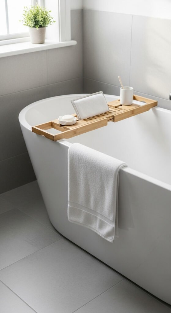 Add a wooden bath caddy from a home store. Use unscented salts and a rolled towel as a headrest. Light a single candle for ambiance.