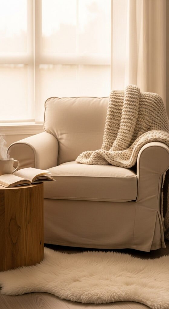 Use a corner chair you already have. Add a thrifted floor lamp and a blanket. Keep books nearby but not piled high.