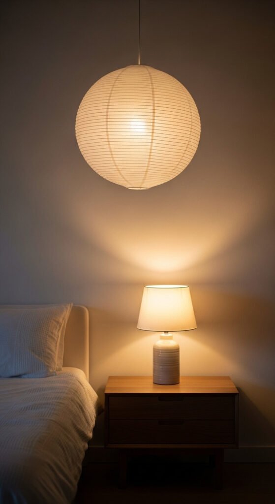 Hang pendants lower over tables to create intimacy. Natural fiber shades work in kitchens, dining rooms, or bedrooms. They’re statement pieces that don’t scream for attention, fitting the understated Japandi aesthetic perfectly.