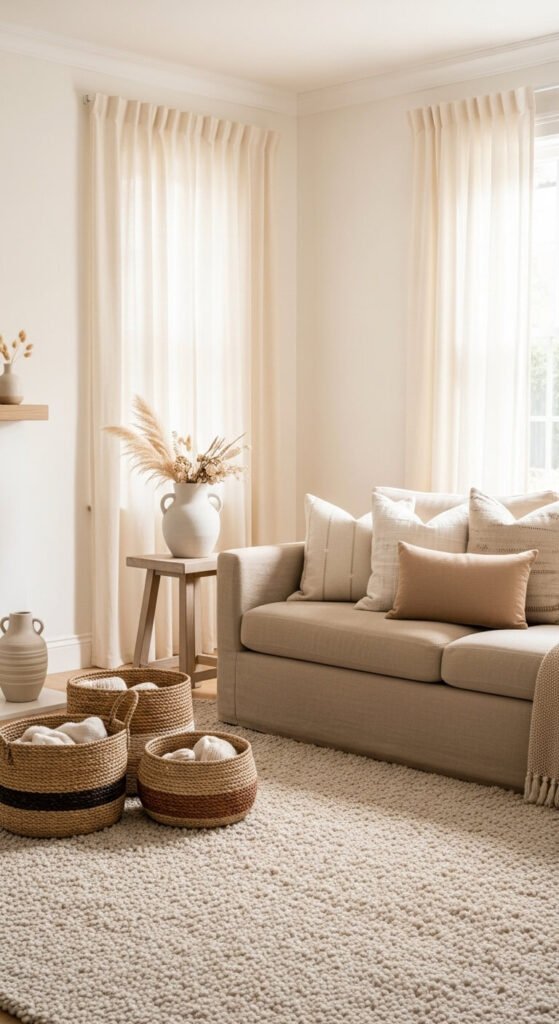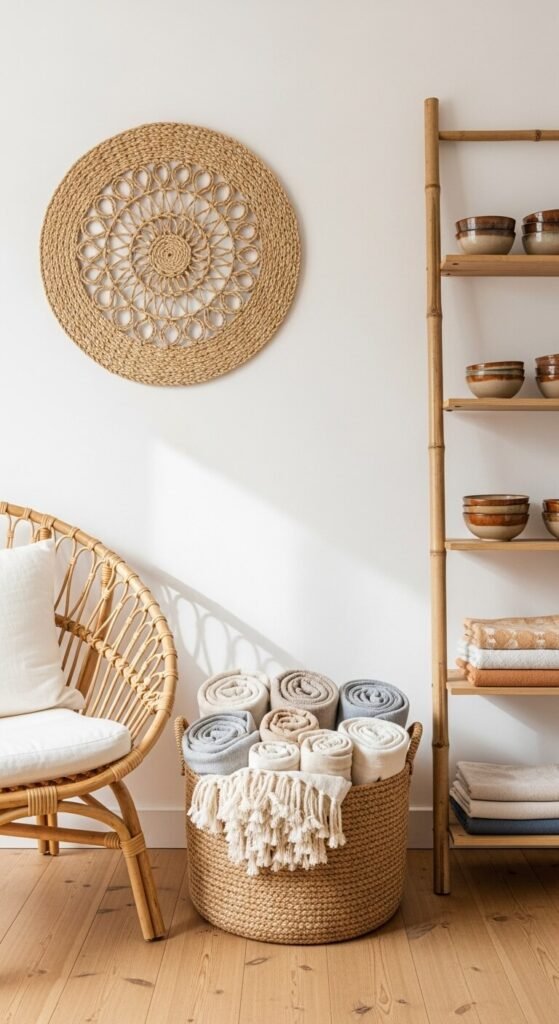 Introduce baskets, rugs, and textiles made from jute, rattan, or linen. These materials add visual interest without busy patterns.
